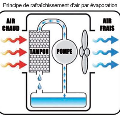 L’eau s’évapore, prend de la chaleur à l’air, et un ventilateur souffle ensuite cet air plus frais (mais un peu plus humide) dans le local, sans utiliser de compresseur de clim classique.